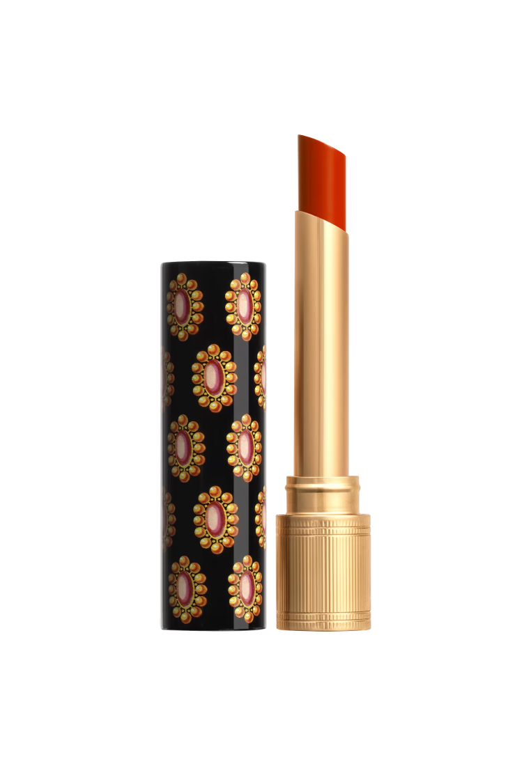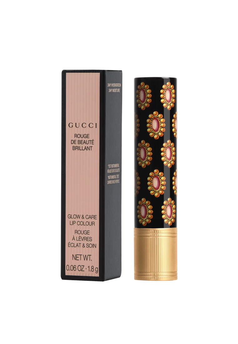 Gucci Beauty's Rouge De Beauté Brillant in 25* Goldie Red (The Gucci Red) — a special lip color set apart by unique benefits. An in-between of a sheer and satin lipstick, the hybrid long-lasting dual-action formula delivers 24 hours of moisture and a beautifully pigmented shine.
